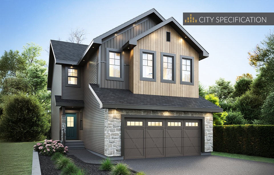 This model includes a main floor bedroom and full bathroom, plus a side entry for added convenience and future suite potential.